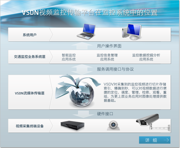 VSDN视频监控传输平台是监控系统的核心组成部件,为满足视频监控各种日常业务的需求,VSDN传输平台主要利用视频采集设备、视频录制存储设备和视频分发服务器等设备,提供视频上传、录制、存储、播放等重要基础功能,同时为智能视频监控、物品标识、监控报警、视频数据挖掘和统计分析等等上层业务功能提供支持。